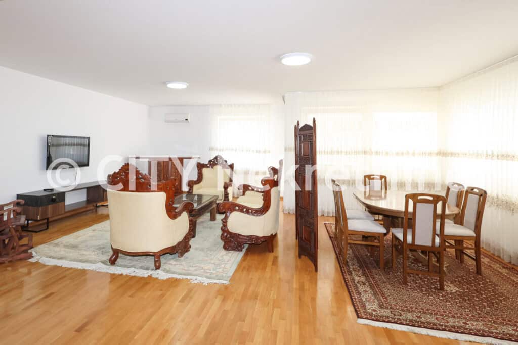 CITY Nekretnine iznajmljuje veći četverosoban namješten stan sa privatnim parkingom u novogradnji prekoputa Vijećnice, općina Stari grad, ukupne površine 165 m2.